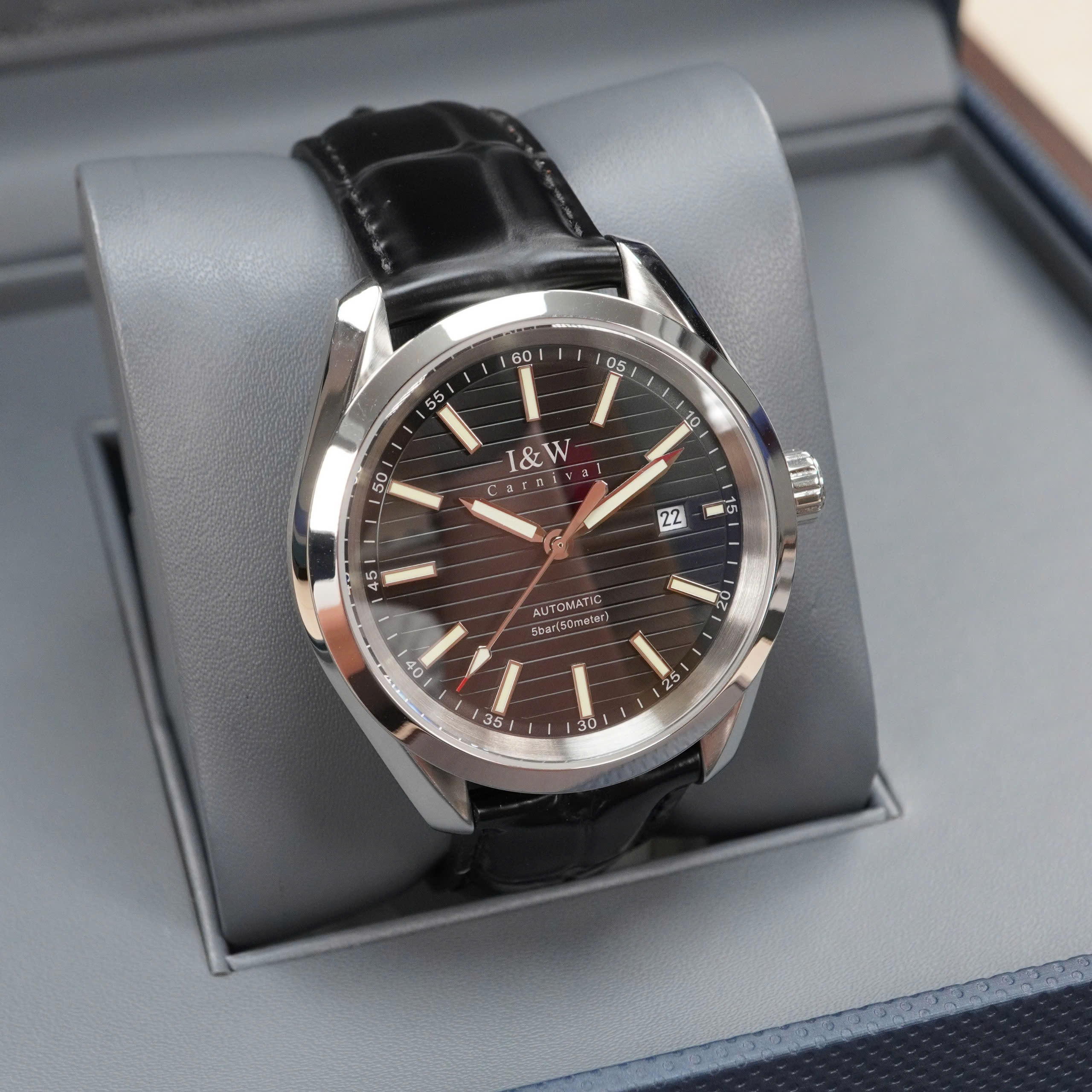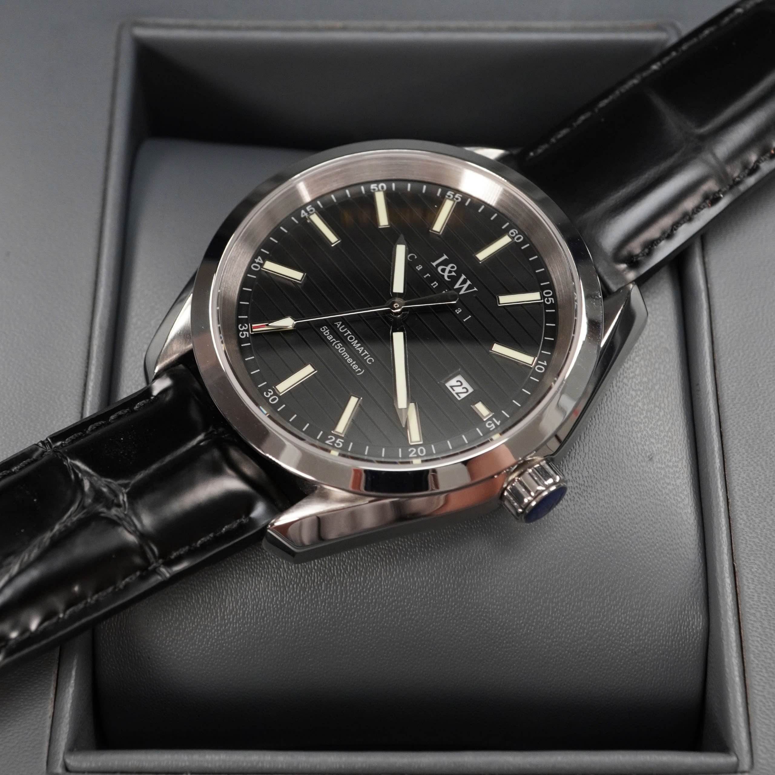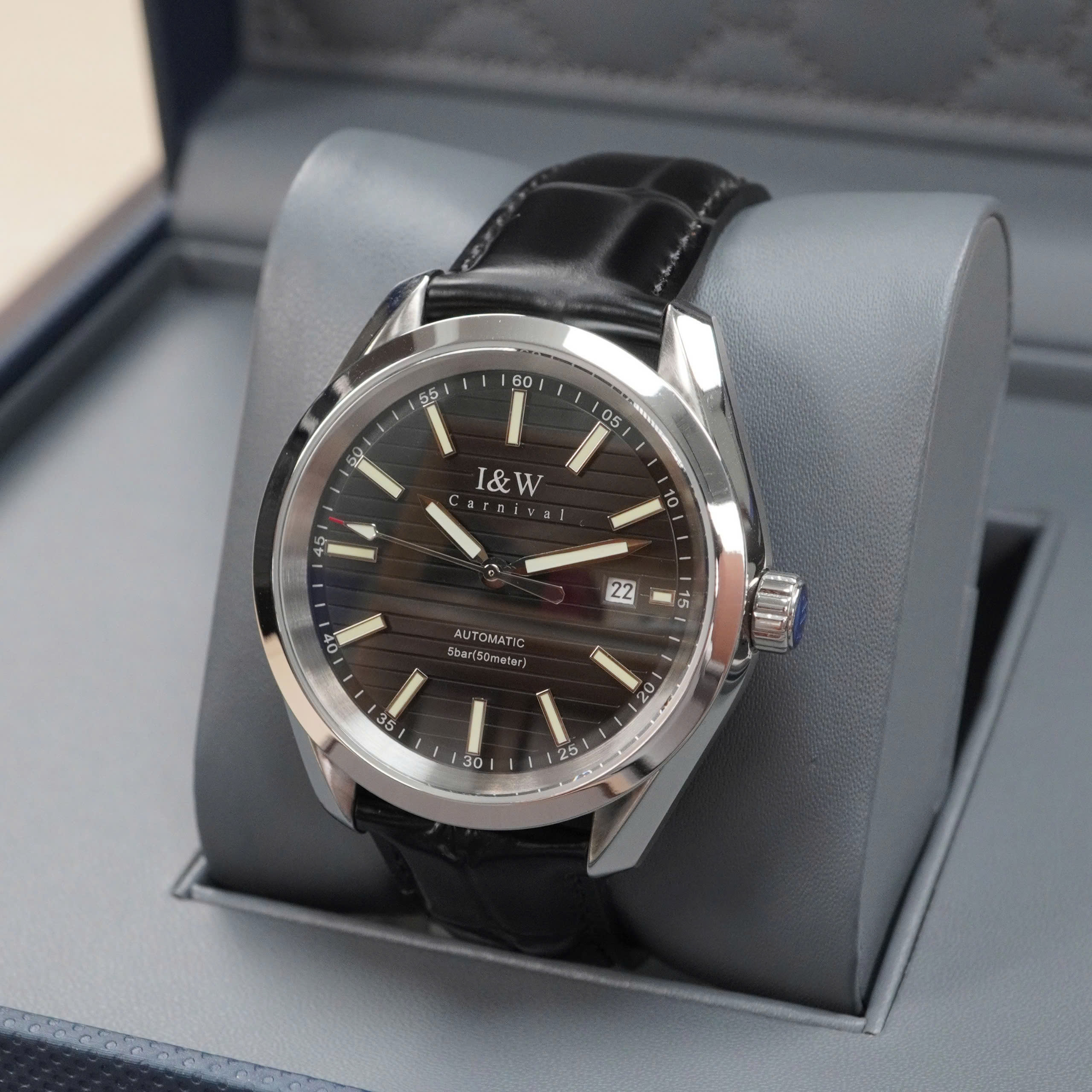 Giới thiệu Đồng hồ nam chính hãng I&W Carnival 713G-D3 kính sapphire,chống xước,chống nước 50m,Bh 24 tháng,máy cơ (automatic),mặt đen dây da