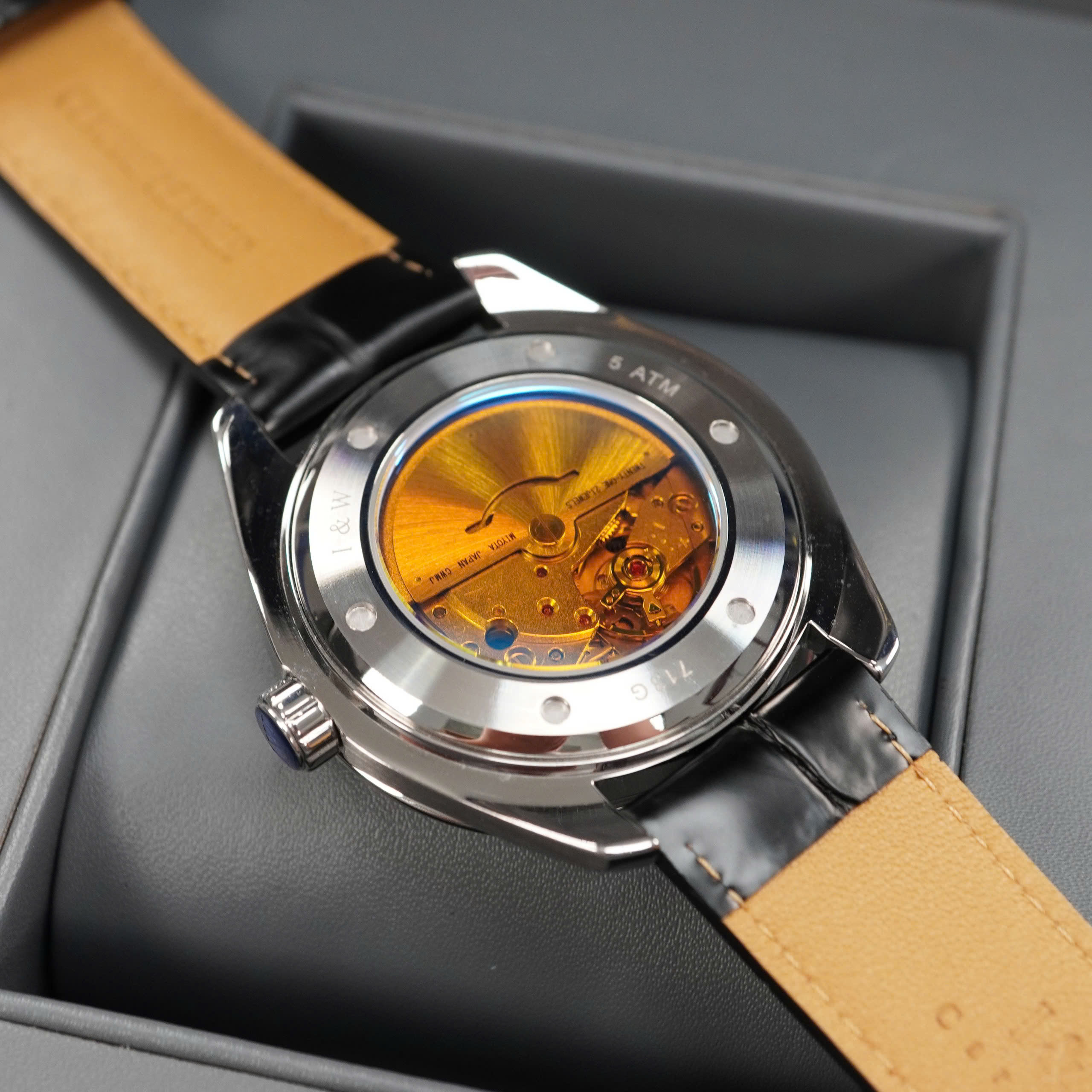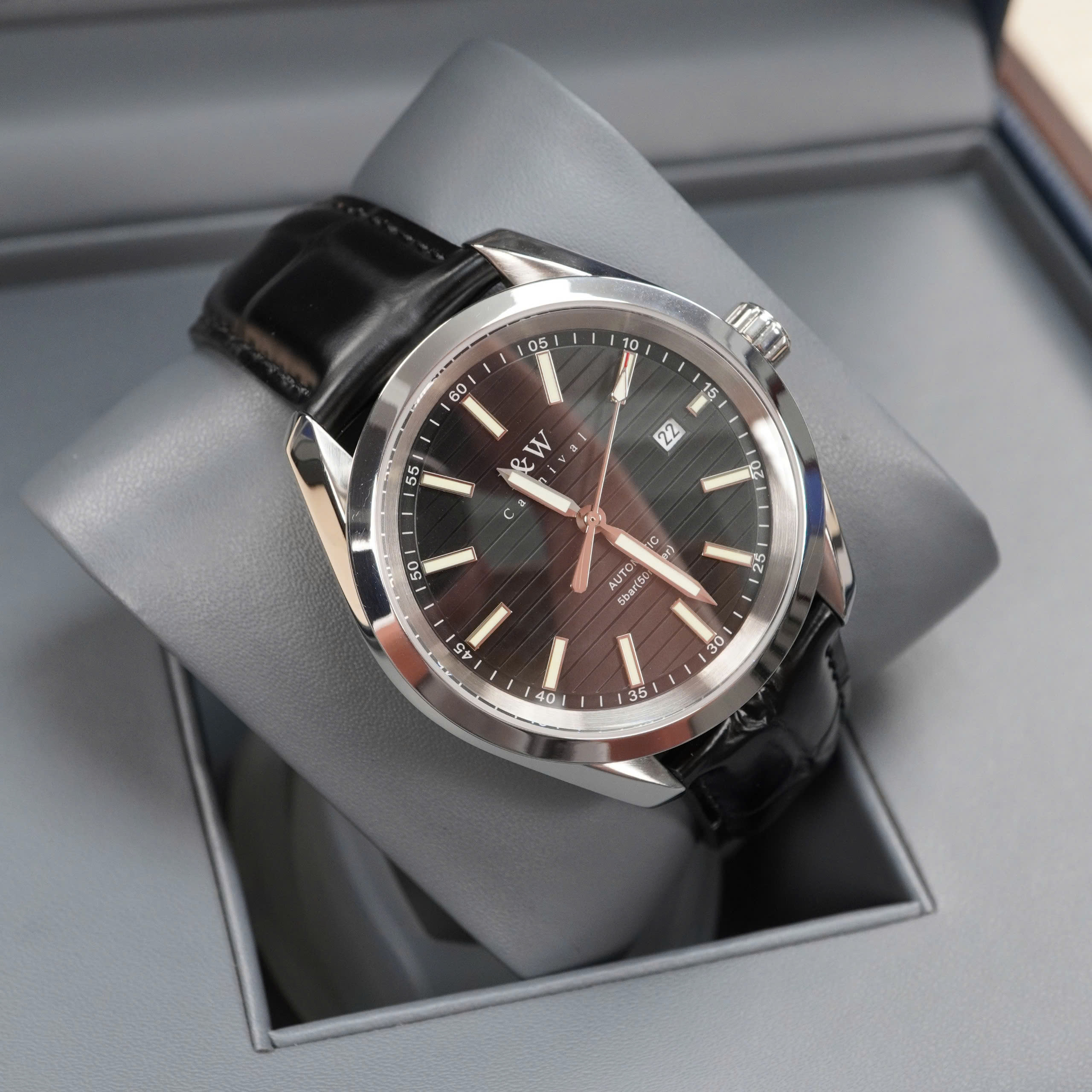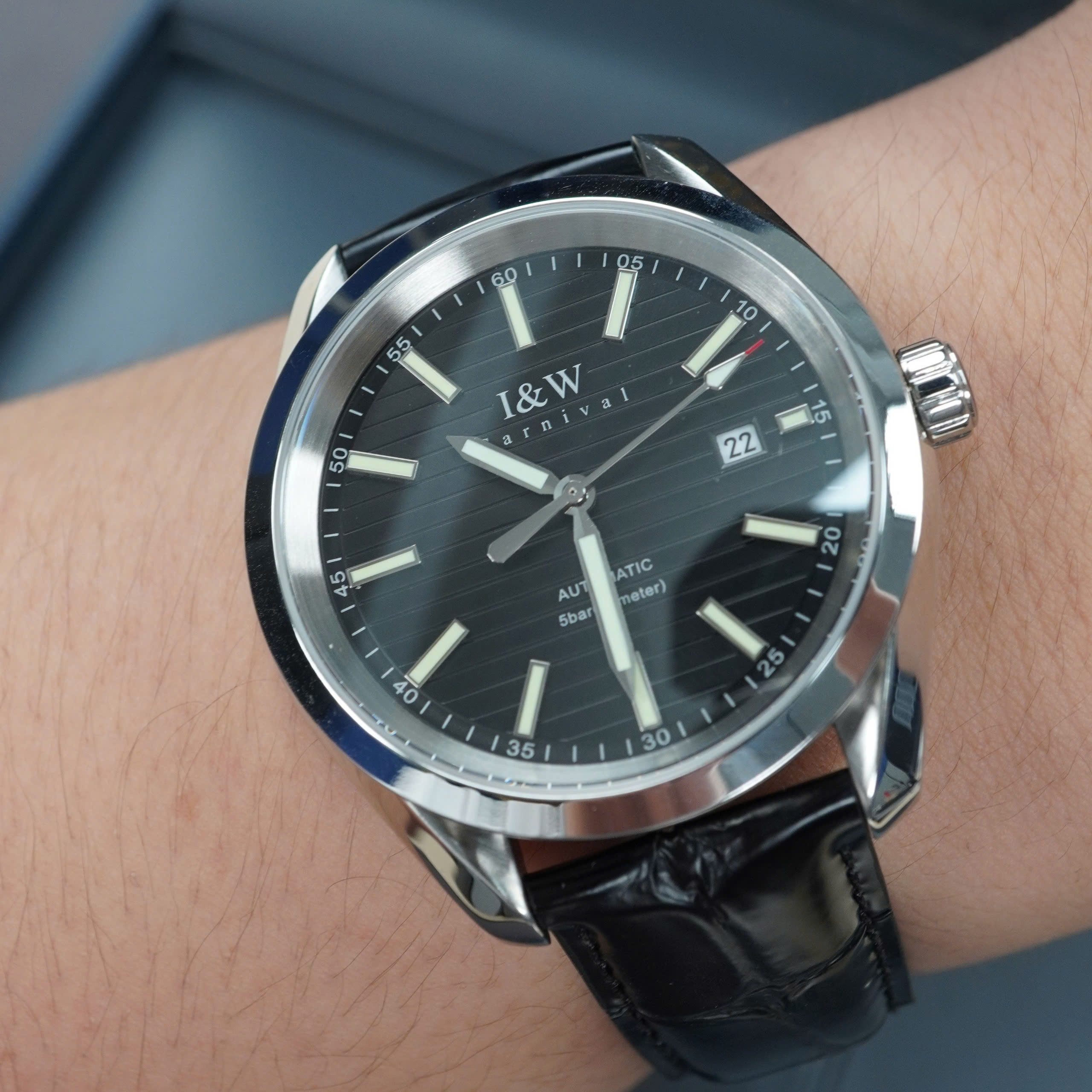 Giới thiệu Đồng hồ nam chính hãng I&W Carnival 713G-D3 kính sapphire,chống xước,chống nước 50m,Bh 24 tháng,máy cơ (automatic),mặt đen dây da