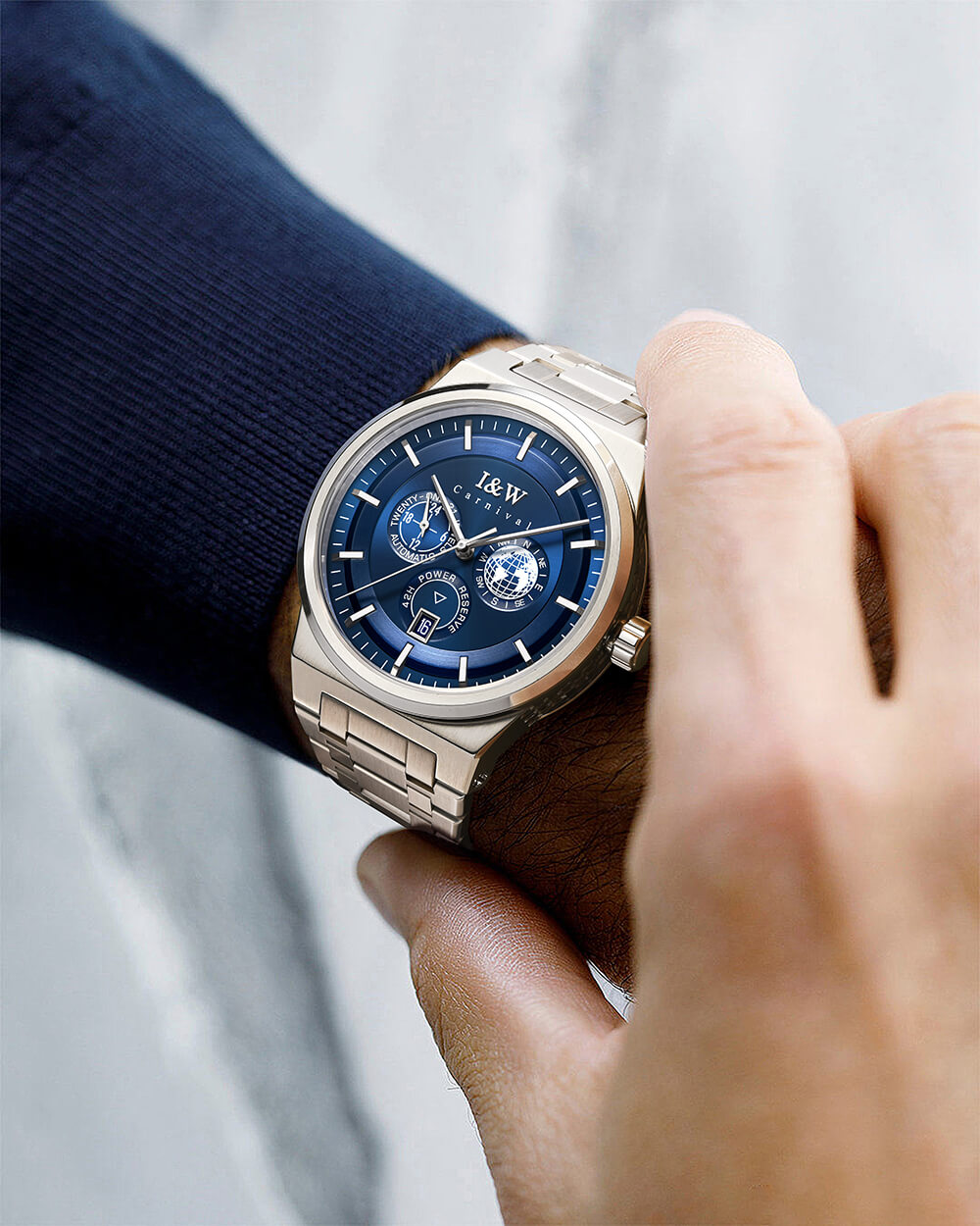 SIÊU PHẨM ĐỒNG HỒ IW CAR.NI.VAL 782G – PHONG CÁCH SANG TRỌNG CHO QUÝ ÔNG MÊ XÊ DỊCH Điểm nhấn độc đáo: Mặt đồng hồ nhỏ trang trí địa cầu 3D – Hình ảnh địa cầu nổi khối kết hợp các ký hiệu phương hướ...